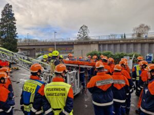 Einsatzort war ein örtlicher Industriebetrieb, wo eine Übungspuppe mit Hilfe der Drehleiter aus dem ersten Stock gerettet werden sollte. Vor Ort wurde den Jugendlichen dann Schritt für Schritt erklärt, wie das Abarbeiten einer solchen Lage funktioniert und sie durften dies dann auch gleich in die Tat umsetzen.