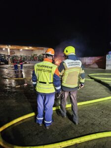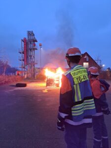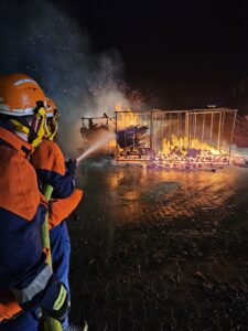 Da die Wehrführung gerade „zufälligerweise“ anwesend war, ging es zu diesem Einsatz inklusive Kommandowagen. Die Augen wurden dann erneut groß, als die Jugendlichen den Feuerschein bereits auf der Anfahrt sehen konnten. Metallgestelle mit Holz gefüllt stellten einen brennenden landwirtschaftlichen Anhänger nach.