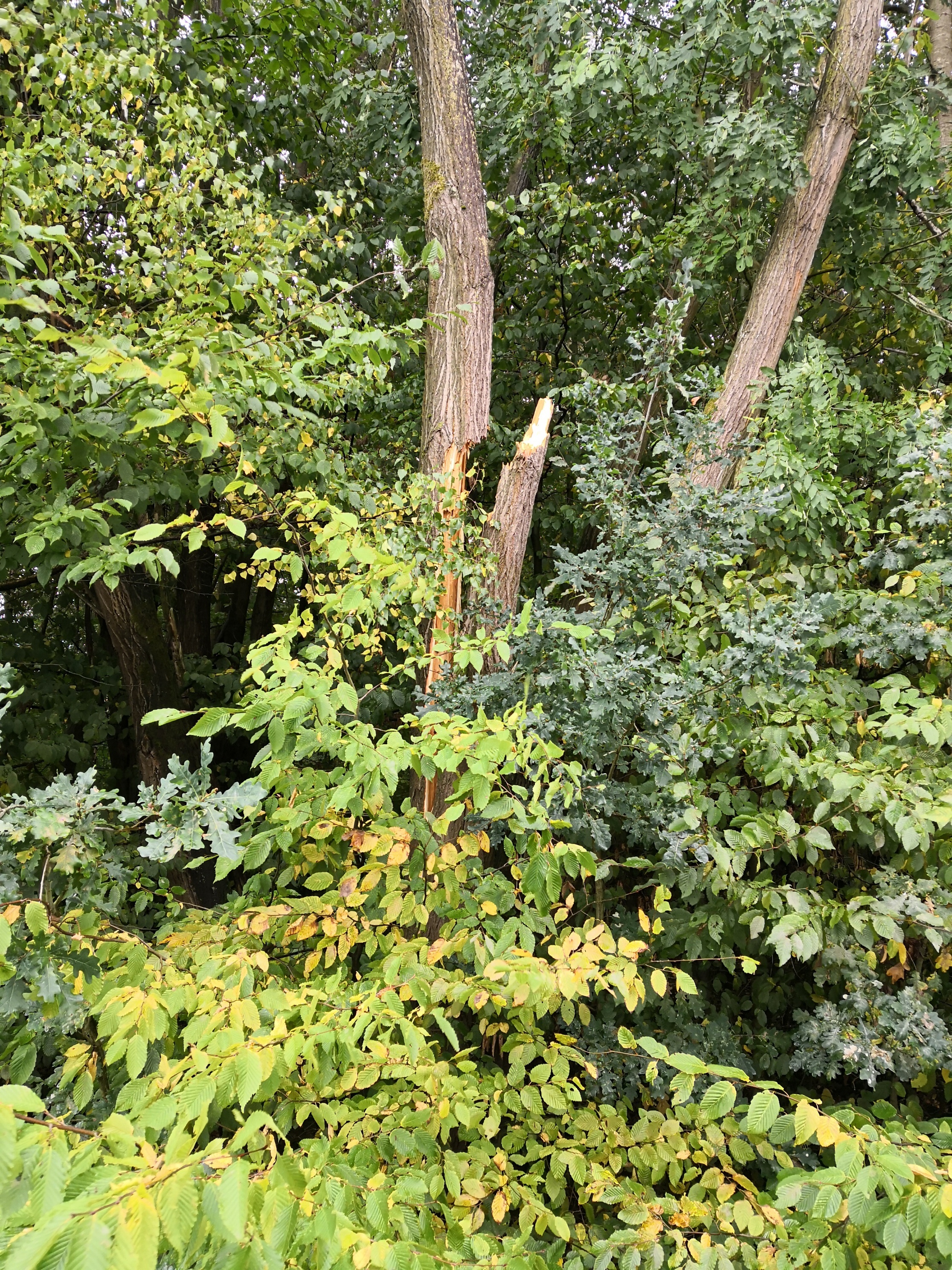 Ein ca. 15 Meter hoher war in der Mitte zerbrochen und drohte in eine Freileitung zu stürzen. Zur Freischaltung der Freileitung forderten wir den Netzbetreiber an. Aus dem Korb der Drehleiter wurde mittels Motorsäge die Gefahr gebannt und der Baum zu Boden gebracht.