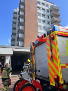 Heute Vormittag wurden Einsatzkräfte beider Standorte zu einer Rauchentwicklung mit Brandgeruch aus einem Hochhaus in der Innenstadt alarmiert. Bei unserem Eintreffen war der Brandgeruch deutlich wahrnehmbar, jedoch war kein Feuer zu sehen. Zwei Trupps unter Atemschutz gingen in das Hochhaus vor, während weitere Einsatzkräfte die Wasserversorgung aufbauten und sich zusätzliche Atemschutztrupps ausrüsteten.