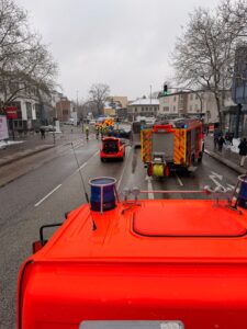 Unsere Einsatzkräfte kümmerten sich währenddessen um austretende Betriebsstoffe und schalteten die Unfallfahrzeuge stromlos. Im Anschluss konnten wir die Einsatzstelle an die Polizei übergeben und wieder einrücken. Die Friedrich-Ebert-Straße war während des Einsatzes, sowie während der Bergung der Fahrzeuge, zwischen den Straßen Damm und Am Rathaus voll gesperrt.